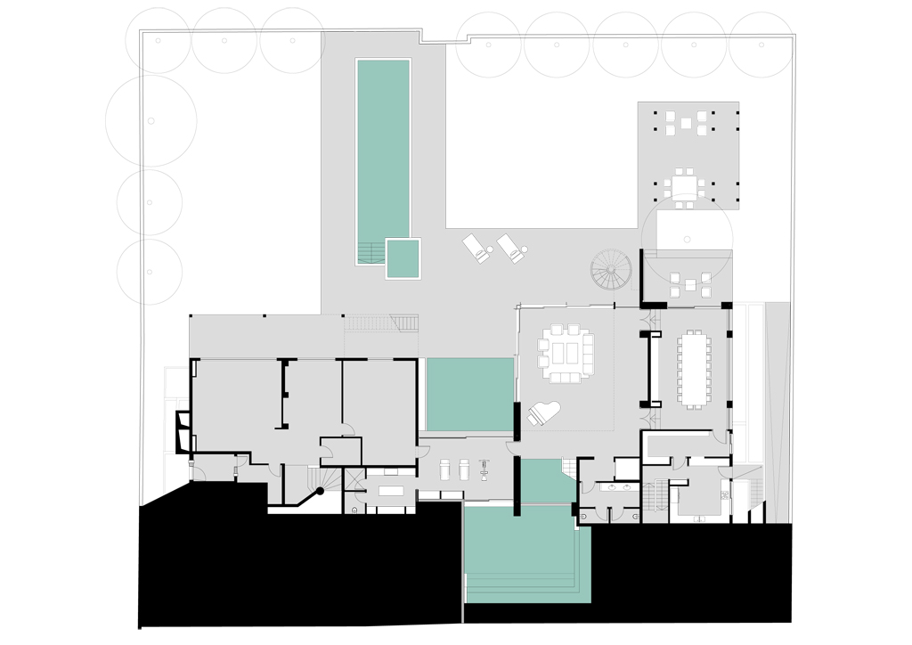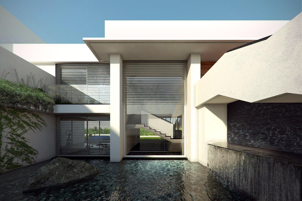 The project extends an existing house, where the clients' request was to provide a multi task space which could serve for large gatherings as well as recreational activity. The entrance level is bridged to the new wing. The guest suites are located at this level, allowing easy access back to the entrance. A catwalk surrounds a double height space leading to spiral steps which descend to the garden. The corner of the garden level is walled with glass allowing an uninterrupted flow through the main hall out to the garden. The gym "floats" on a body of water between the existing house and the new wing. The dining room is adjacent to the main hall.