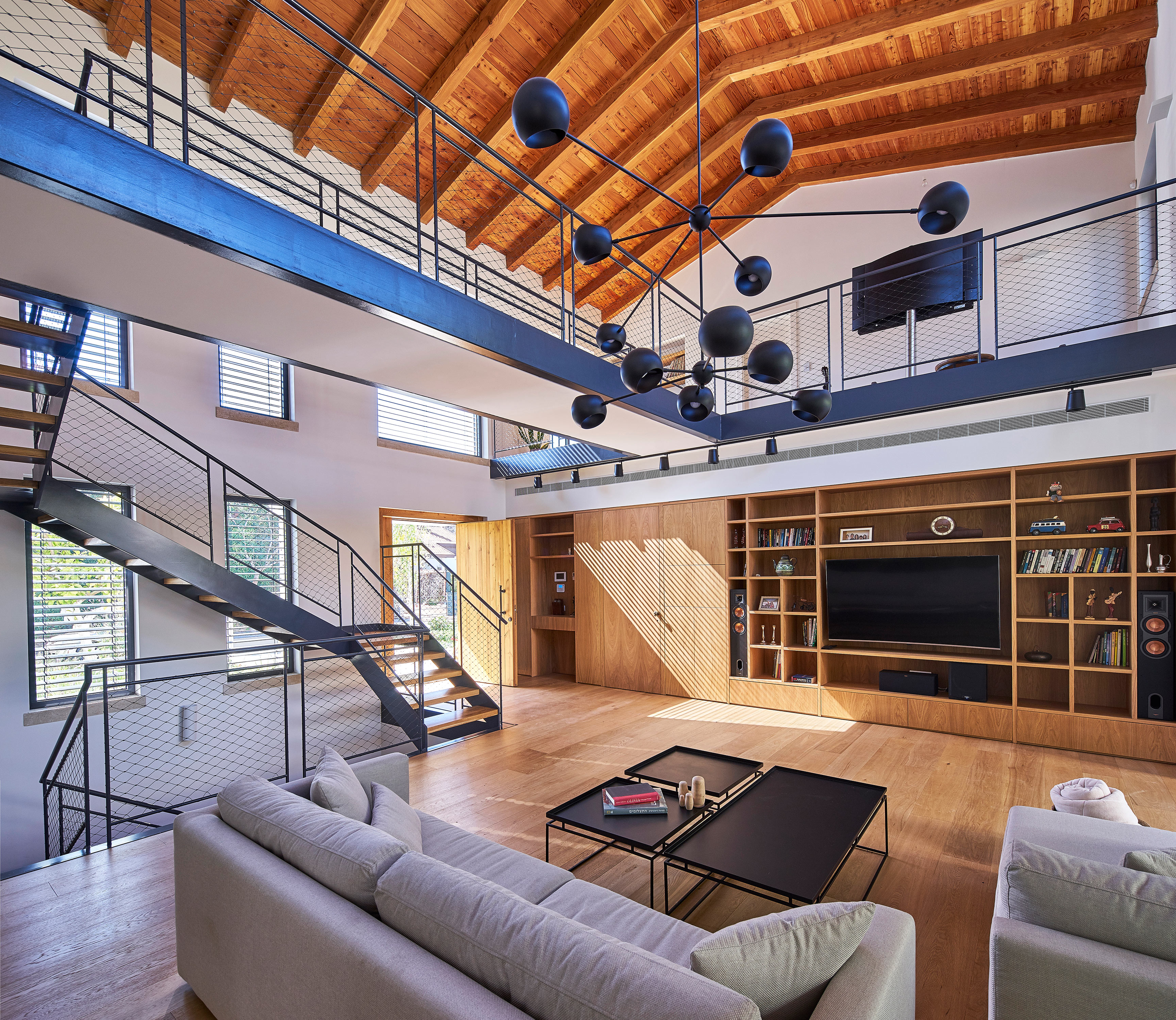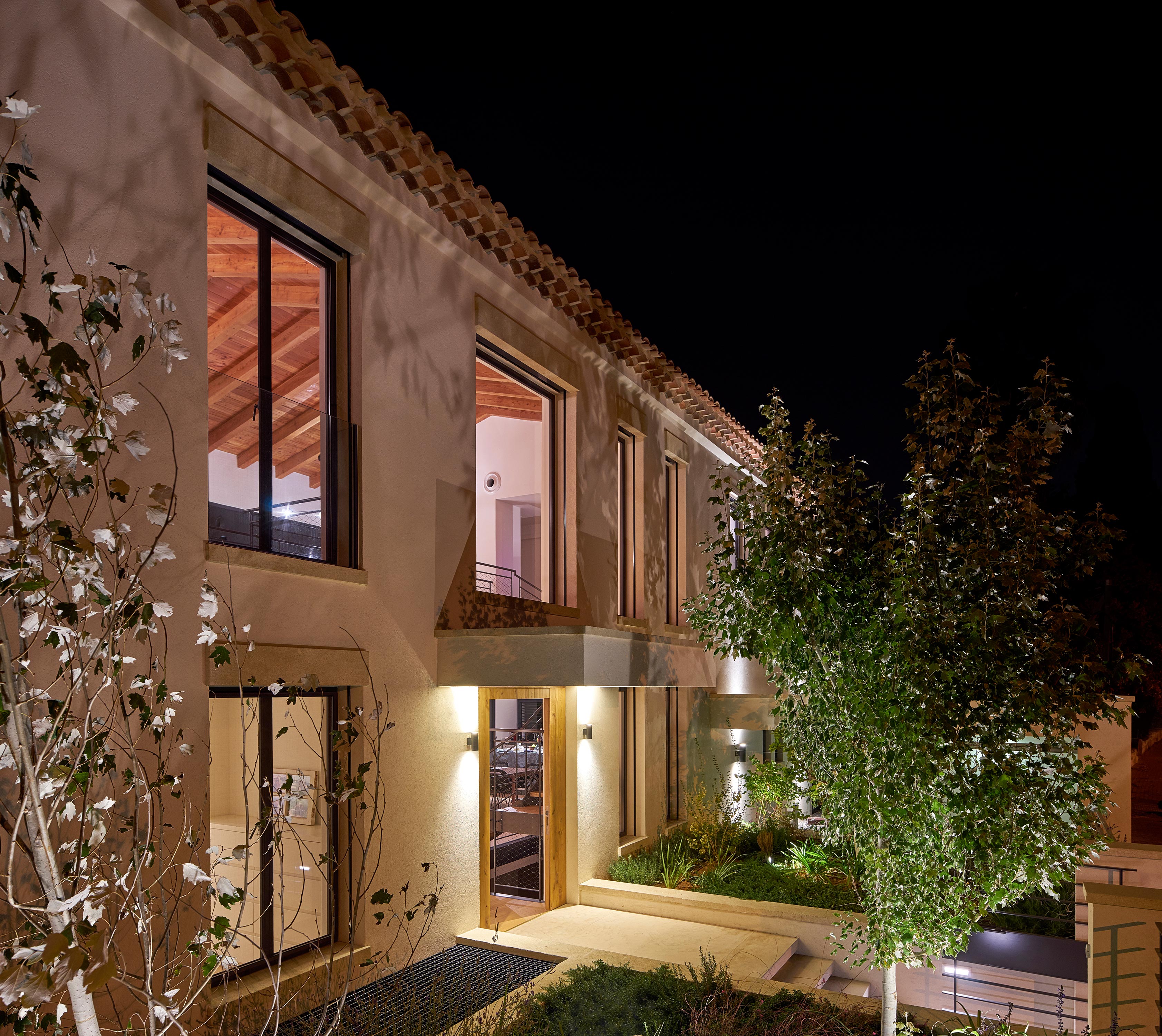 An essentially modern house with French-Provence-inspired facades. The double height wooden ceiling allows views from the ground floor onto an open family gallery and maximizes the airy feel of the relatively small interior volume.