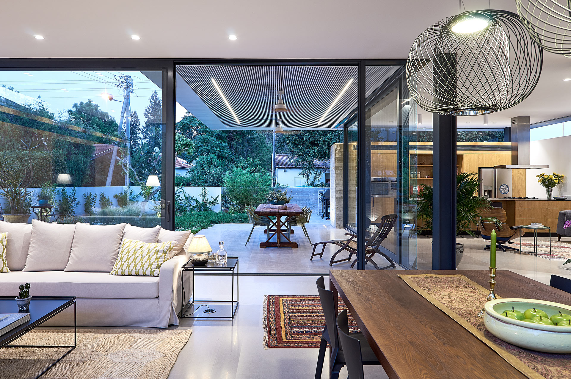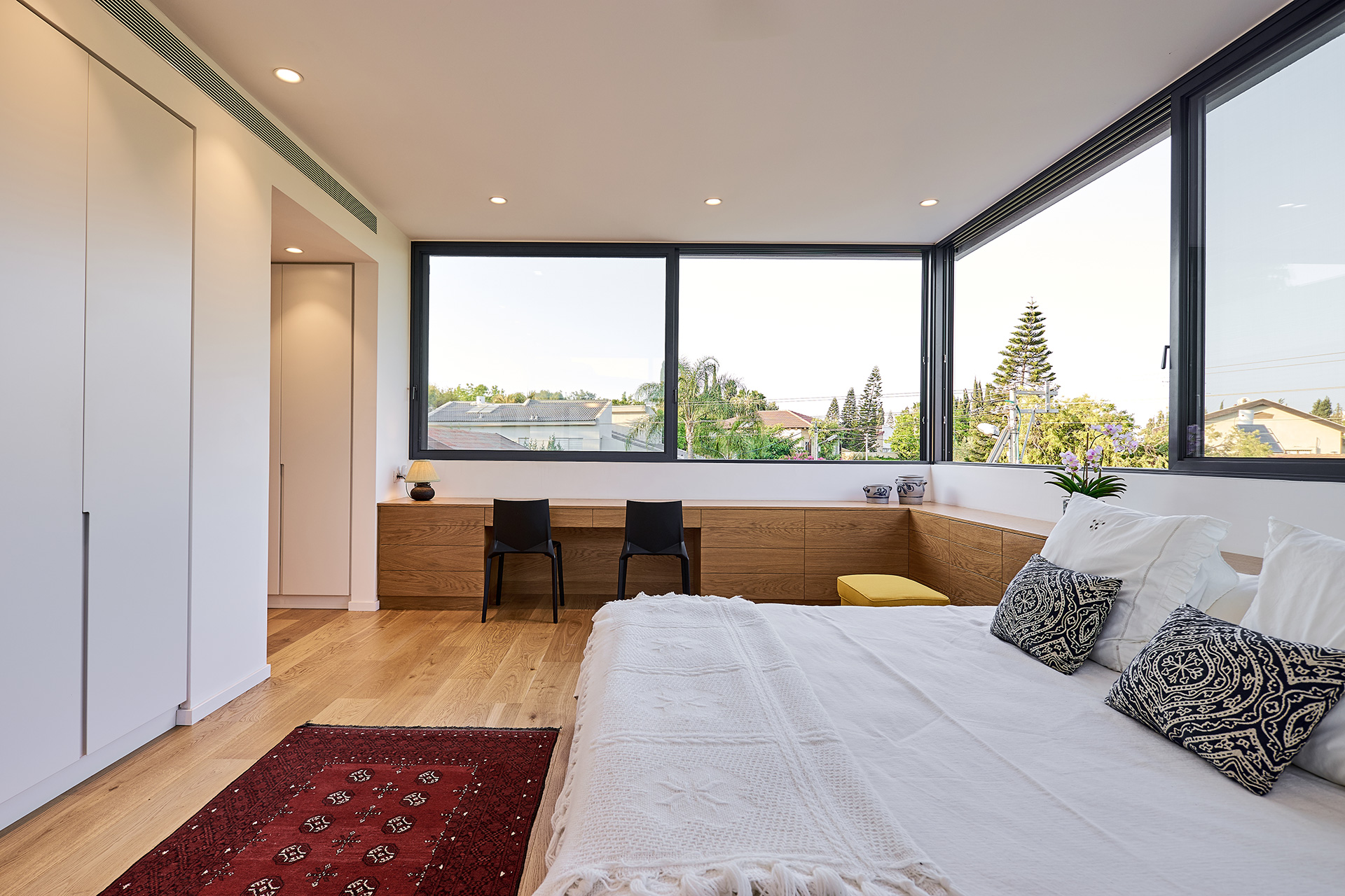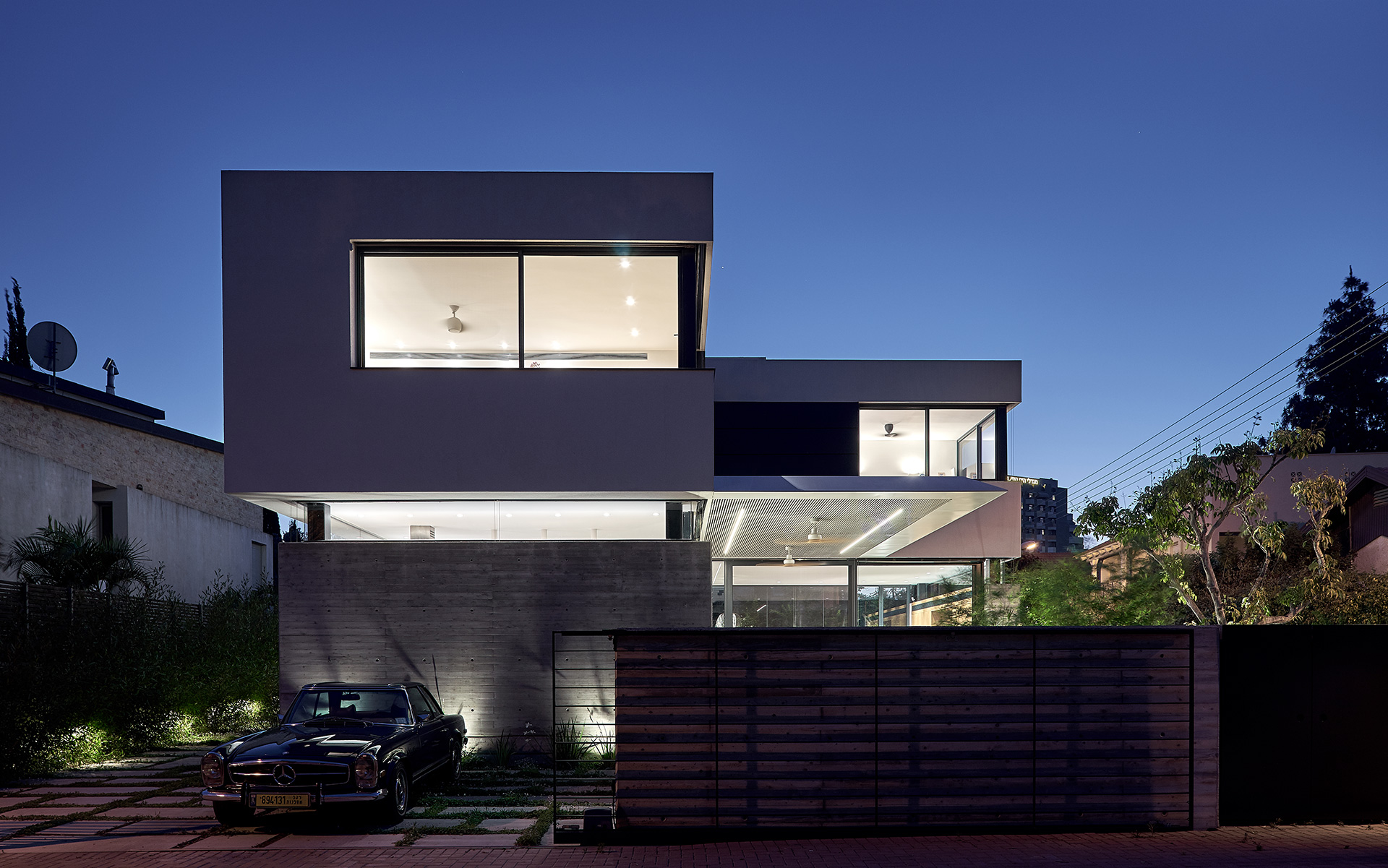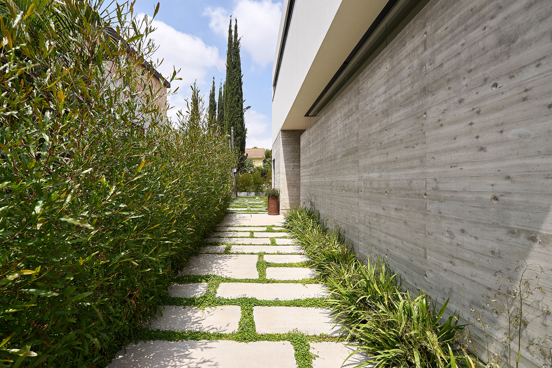 An L shaped, luxury, single-family detached house, maximizes the views to the main, front facing garden. The entrance path, enclosed with concrete walls, flows into an open plan layout with a panoramic view to the private garden. Ground floor concrete walls act as a solid foundation to the floating upper floor, emphasized by the contrast between the bare concrete and white plastered upper floor exterior.